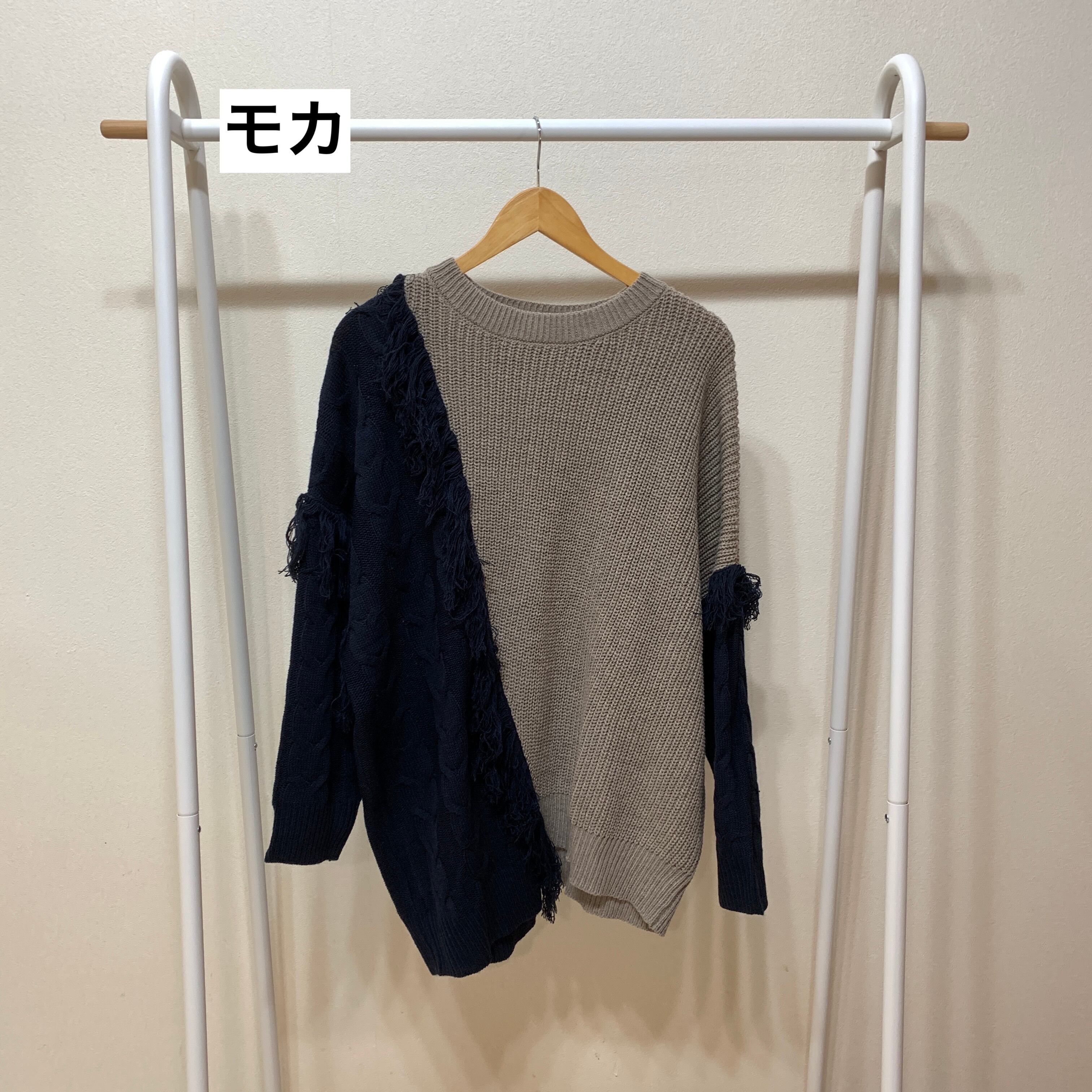チュニック丈ニット フリンジデザイン ゆったり 配色ニット ケーブル バイカラー フリンジ