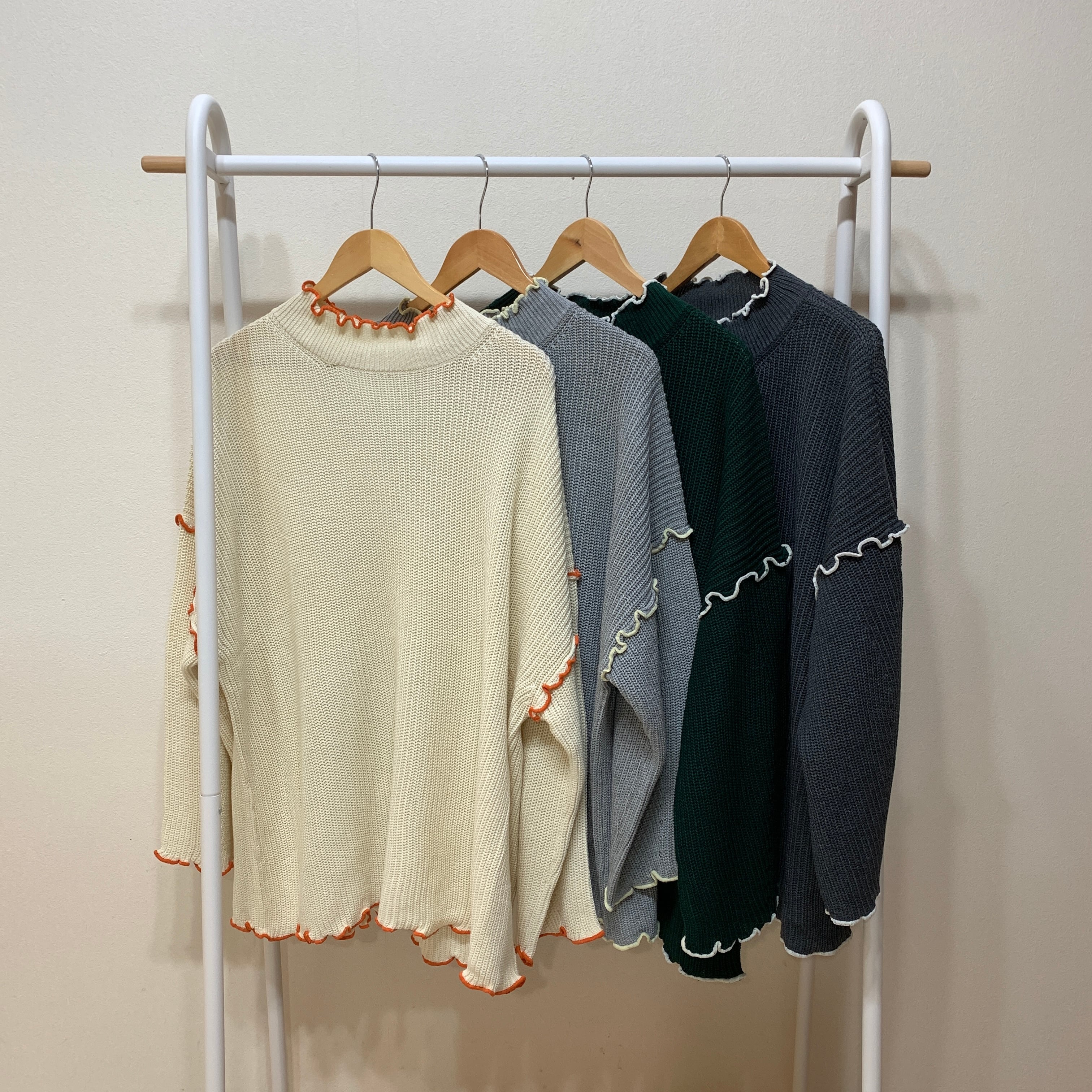 配色メロウ ニットプルオーバー オーバーサイズ ルーズシルエット 片畔編み 大きめ キレイめ アイボリー グレー グリーン チャコール レディース
