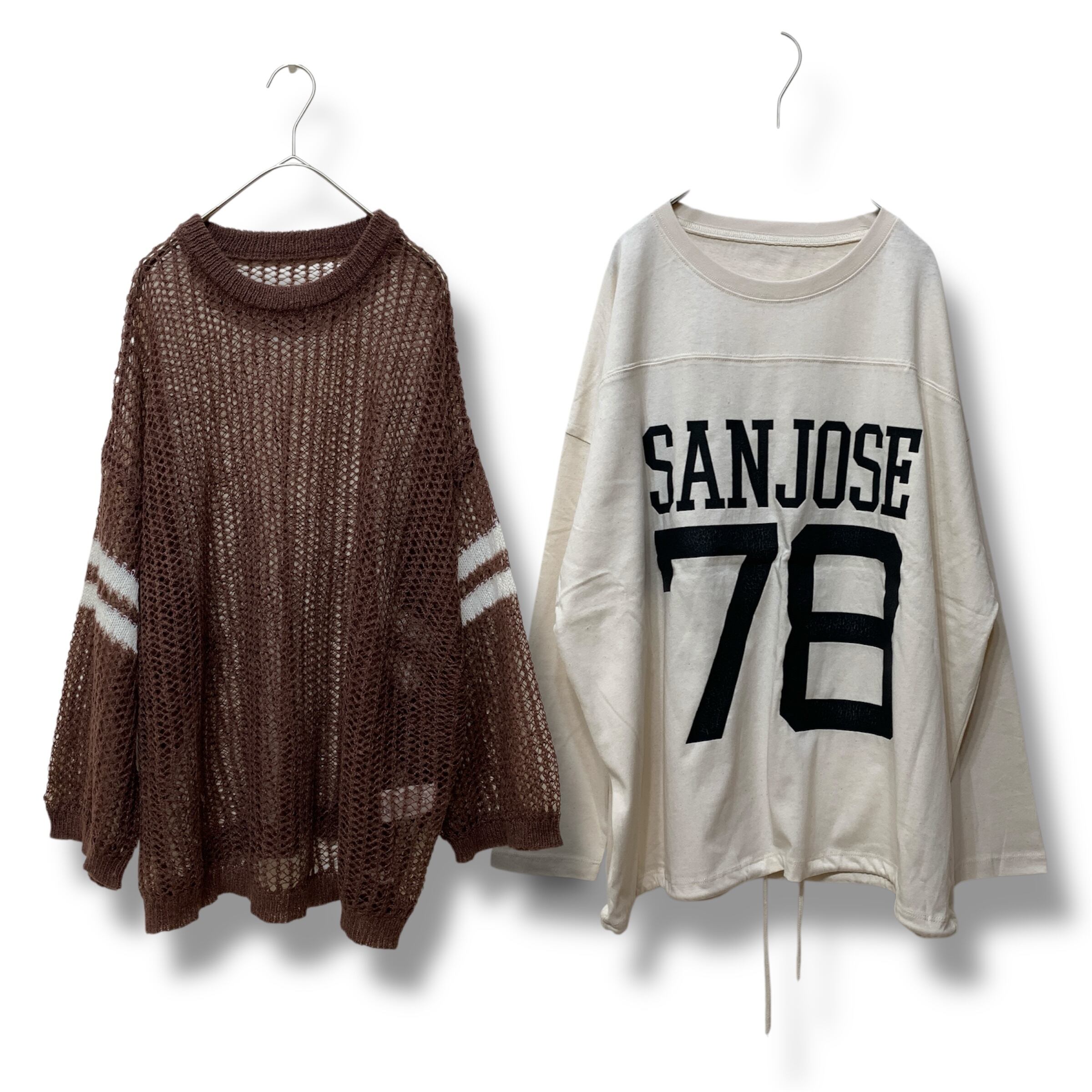 ざっくりとした透かし編みニットにスポーティなラインを入れ、軽快な印象に仕上げています。